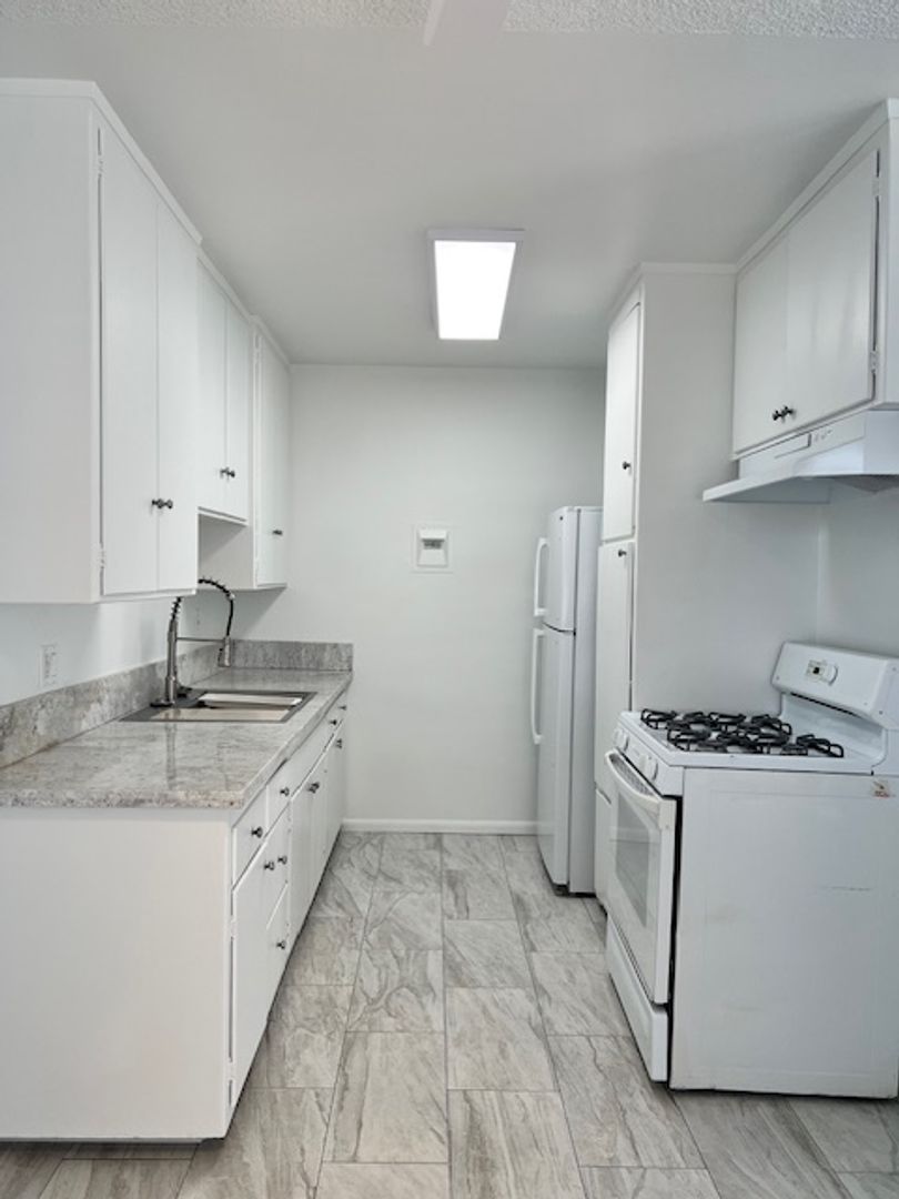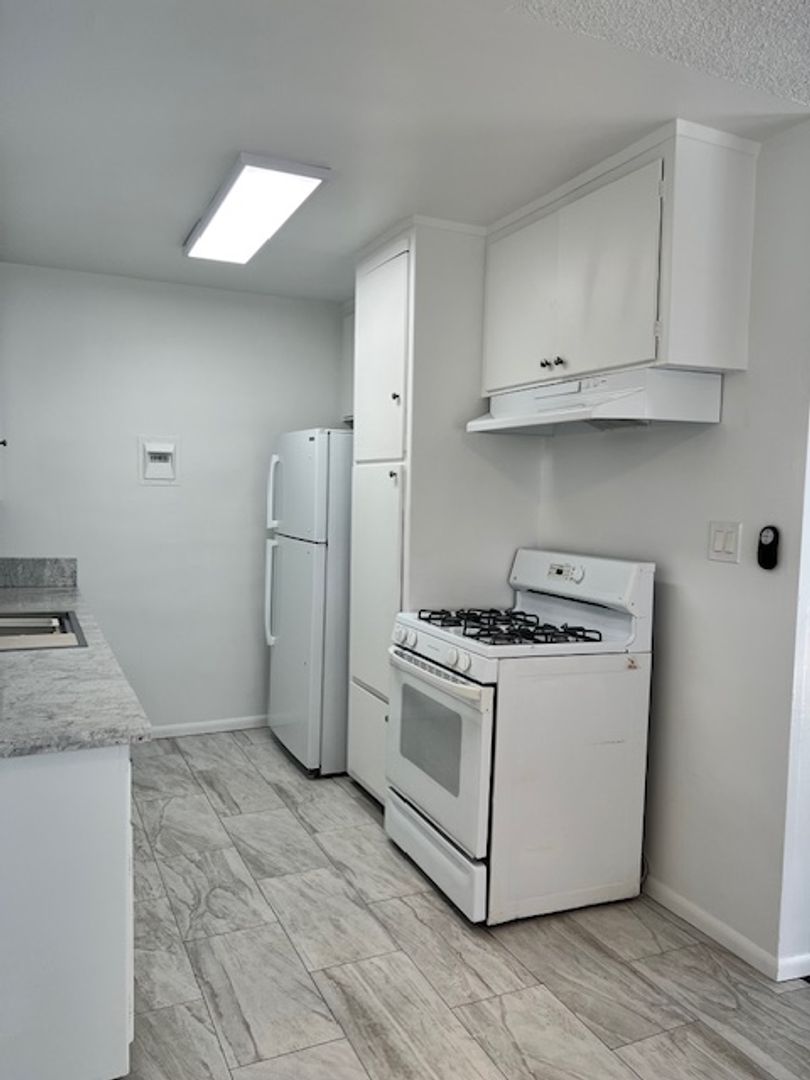 The kitchen has new quartz countertops with plenty of cabinets, includes a stove and refrigerator.