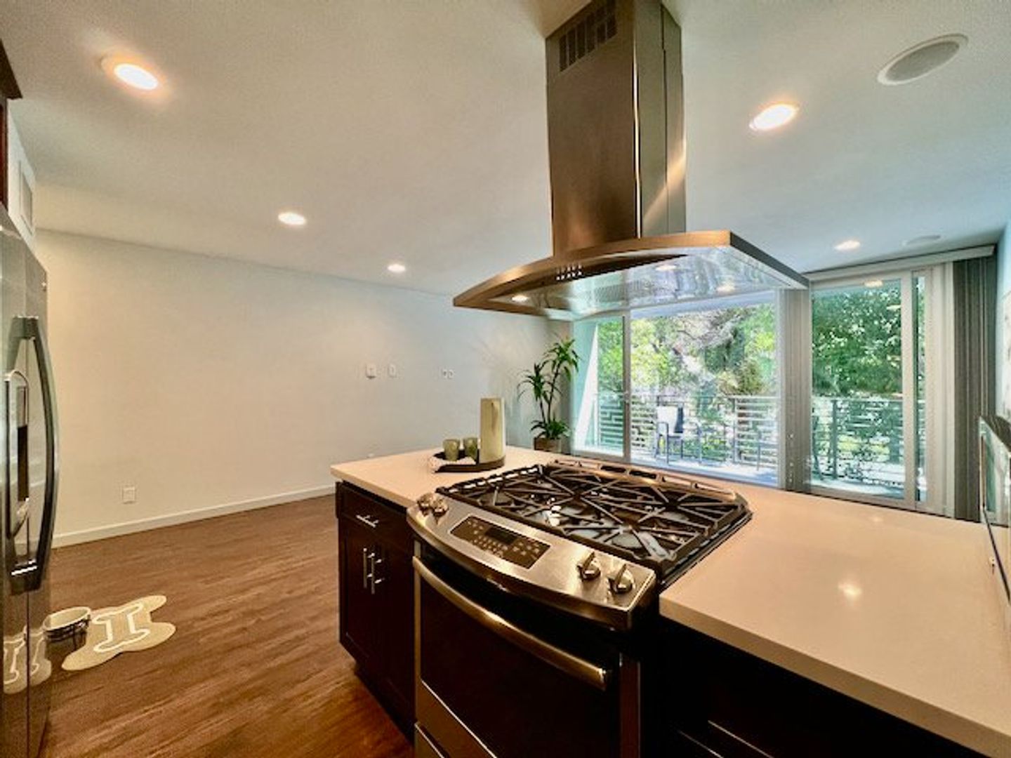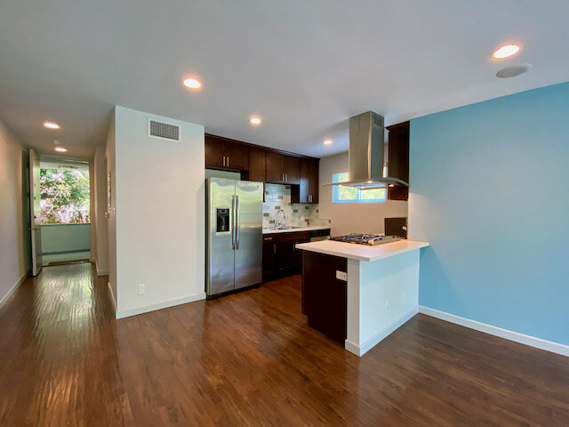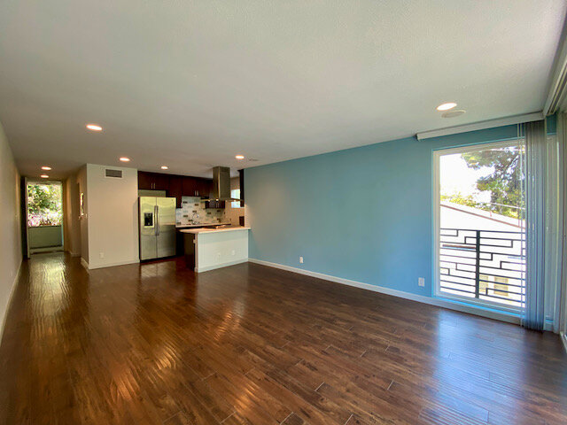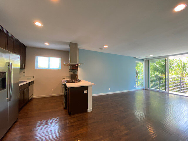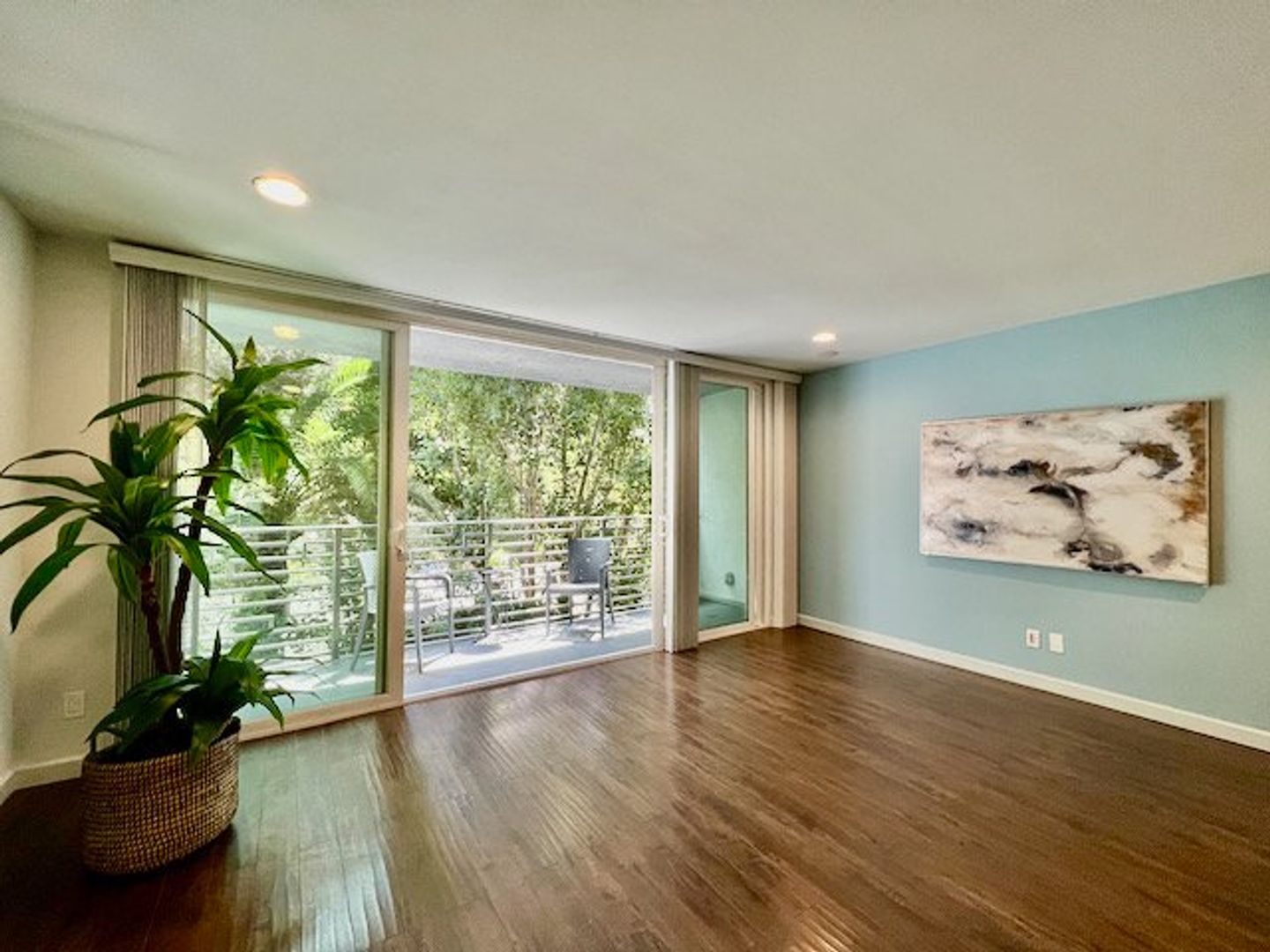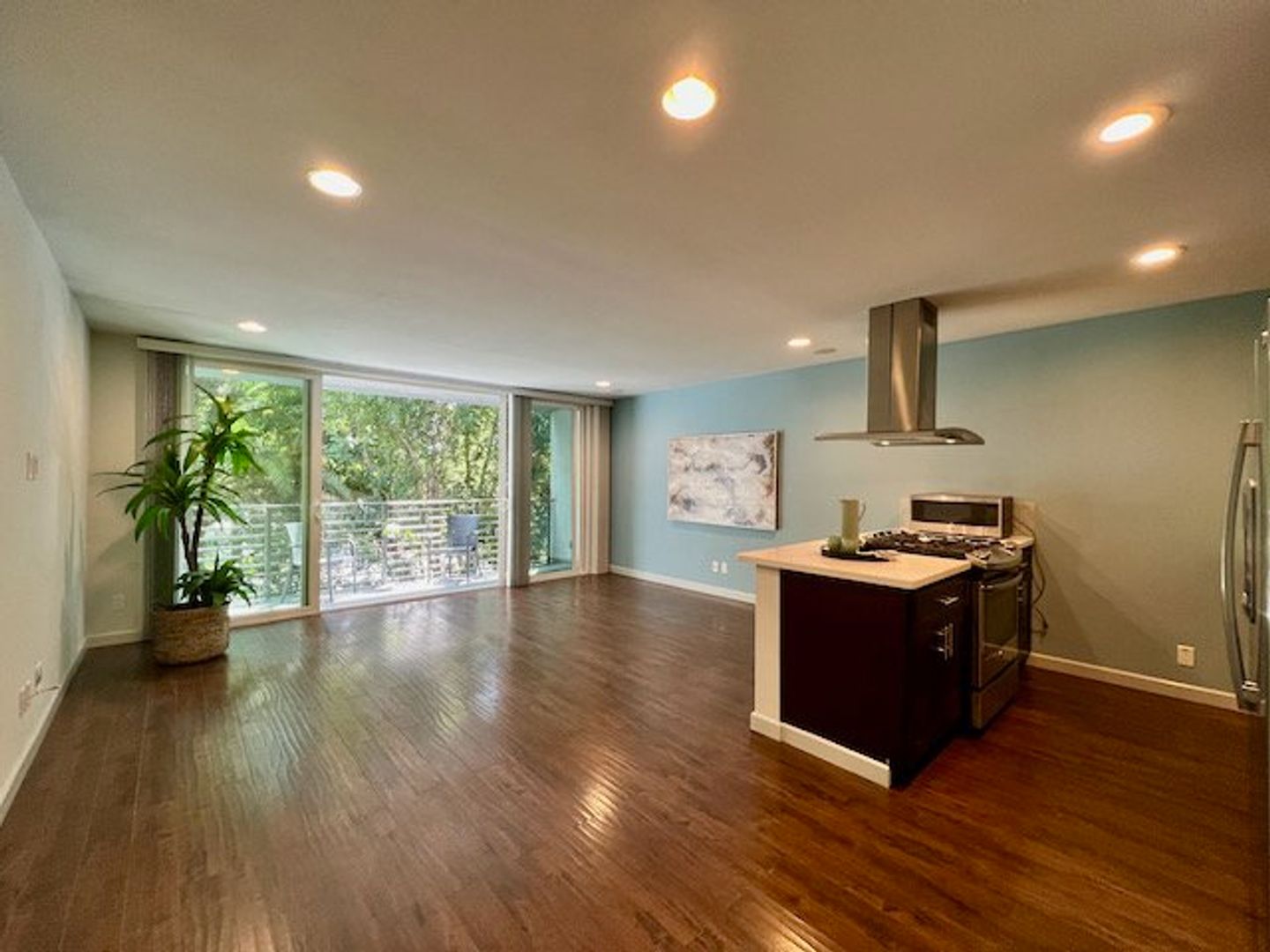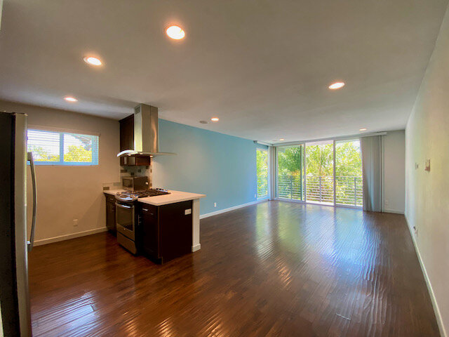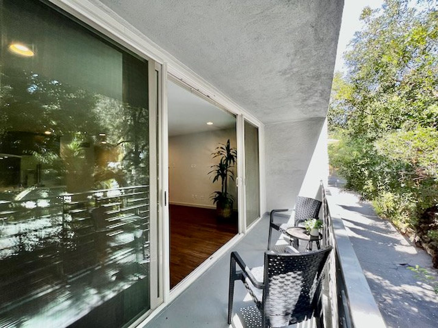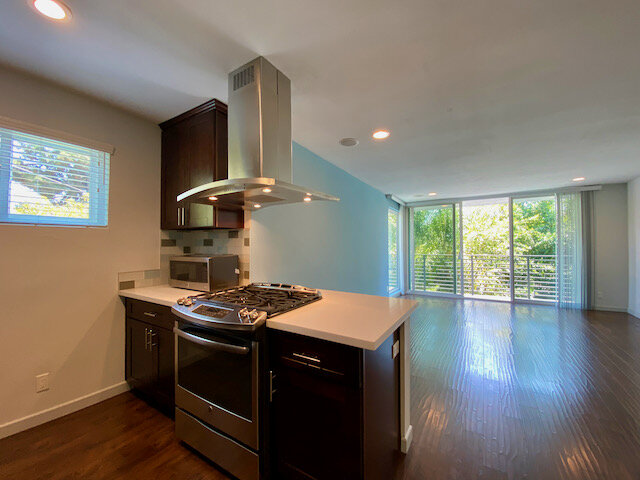 COMPLETELY RENOVATED First Floor 1 BR/1 BA unit w/ luxury appointments and huge floor-to-ceiling windows opening to a balcony offering a sweeping view of the Hollywood tree line. Completely renovated w/ the latest designer features and appliances, including new dark hardwood floors, custom recessed lighting, frosted glass doors, in-unit washer/dryer and central AC & Heating. Cable/internet ready, blue tooth iPhone cradle and speaker system and 2 custom outlets for easy wall-mounted flat screen television installation. Gorgeous center island kitchen is light and bright and offers dark wood wrap cabinets, Caesar stone counters, custom tile splash guard, brand new stainless steel appliances and a ceiling mounted hood over the gas range. Community amenities include a swimming pool, intercom access, and controlled- access parking. All the quiet of the canyon while just steps from Hollywood & Highland! Across the street from a small private (members only) dog park.For showings, please contact Tierra at 530-604-6766 or Jeff at 516-205-3878